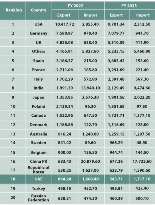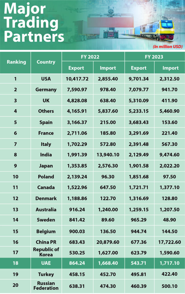 Bangladesh has pursued an export-oriented industrialization strategy, significantly boosting trade flows. The country has enjoyed a trade surplus in recent years, driven by robust export performance. The country’s exports grew 6.67% year-on-year and reached $55.55 billion in FY2023, riding on the extraordinary performance of the apparel sector. In FY2023, export earnings crossed the milestone of $50 billion for the second consecutive year. The earnings were $52.08 billion a year ago (a 34.40% increase from the previous year). The RMG sector alone experienced a 35.47% growth in exports. It was reported that the share of high-value apparel items is growing, which is working as a driving force. The export of home textiles, leather products, agricultural products, engineering products, and pharmaceuticals also saw substantial increases. What is also promising is that exports to new markets, such as Japan, Korea, India and non-traditional ones, are also rising.
