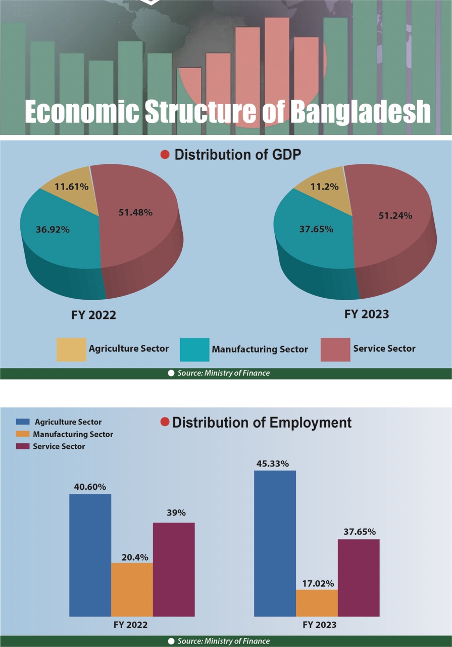 The service sector is the largest contributor to Bangladesh’s GDP, accounting for around 51% of the GDP and provides 38% of the total jobs in the country. The sector is increasingly becoming an important avenue for value, knowledge and technology-led economic growth. Key sub-sectors include wholesale and retail trade, transport, financial services, including the banking sector, telecommunication and IT, repair of motor vehicles, storage, accommodation, and food services etc. The sector experienced a growth rate of 6.3% in FY2021-22, highlighting its critical role in the economy. A decade ago, this industry employed a modest 50,000 individuals, but recent years have seen a remarkable transformation with the government successfully creating two million IT jobs, and they aim to add another one million to the IT workforce by 2025. The growth of the service sector is indicative of the broader economic transformation, shifting from an agriculture-based economy to one dominated by services and industry.